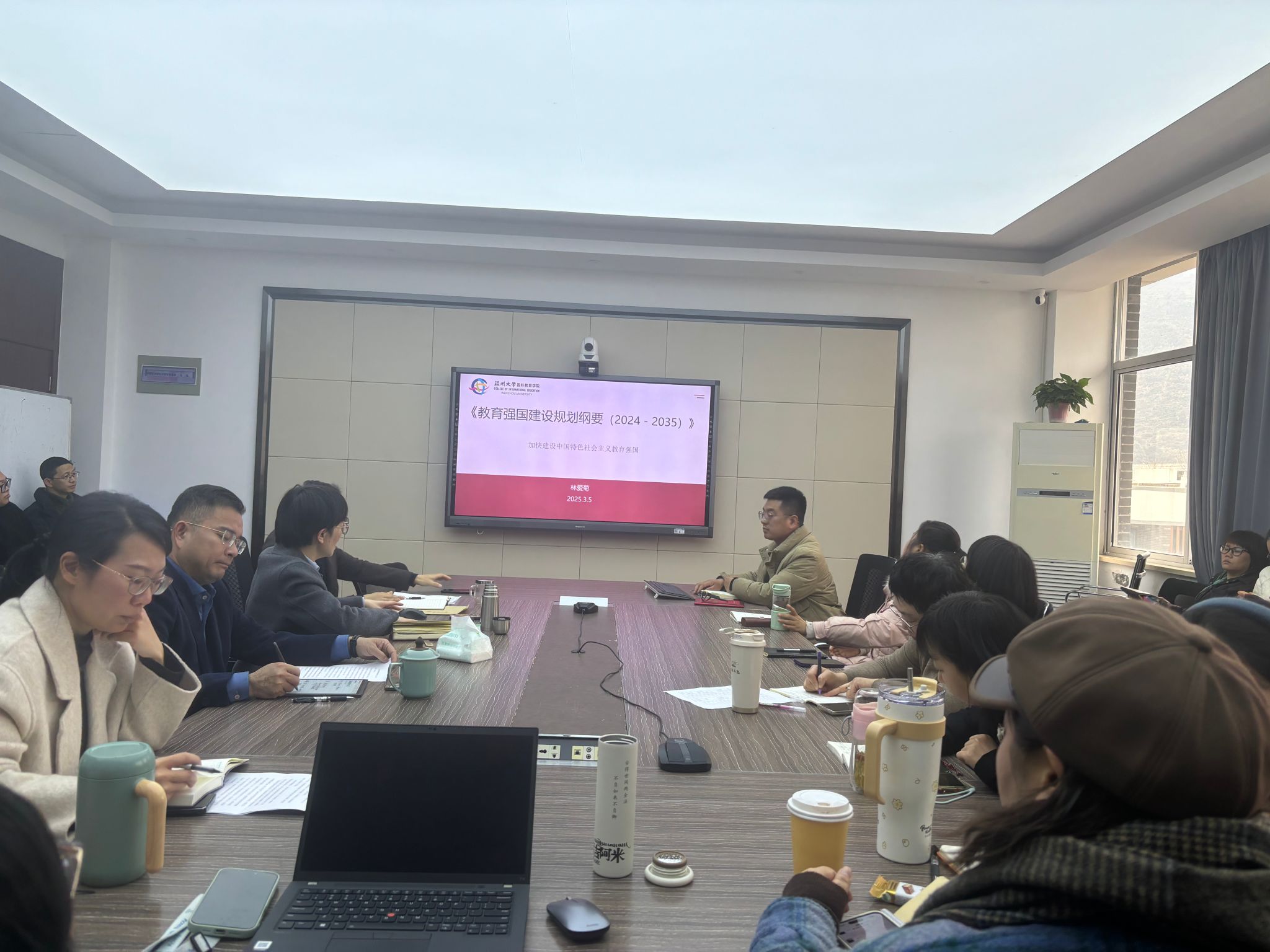 随后,林爱菊书记领学《教育强国建设规划纲要(2024 - 2035)》。林书记从《纲要》的总体要求与目标、聚焦九大重点任务、新提法及教育对外开放四个方面,详细解读其精神。她指出,《纲要》是指导我国建设教育强国的纲领性文件,为新时代教育改革发展指明方向。林书记强调,全体教职工要认真学习领会《纲要》精神,切实将思想和行动统一到党中央决策部署上来。要结合学院实际,聚焦 “留学温大” 品牌建设、国际化人才培养、国际交流合作等重点工作,主动对接国家战略需求,积极服务地方经济社会发展,为推动教育强国建设贡献力量。