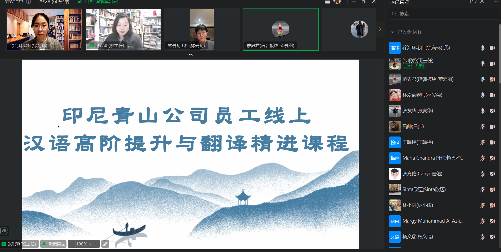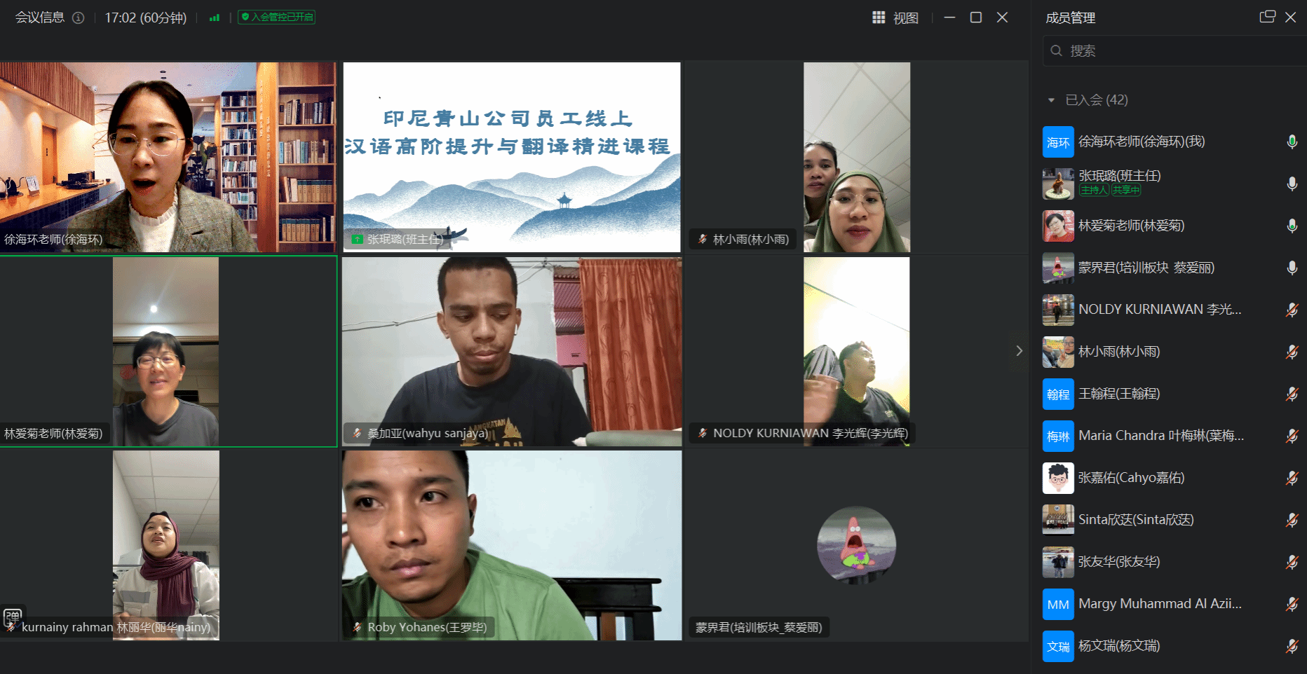 为助力印尼青山公司员工提升汉语水平,搭建高效的线上汉语课程平台,4月10日晚,由beat365中文官方网站与印尼青山公司联合打造的 “线上汉语高阶提升与专业翻译精进课程”正式开班。此次合作是双方在多期 “中文 + 职业” 培训项目基础上的进一步深化,旨在满足印尼青山员工日益增长的汉语学习需求,为企业的国际化发展提供强有力的语言支持。