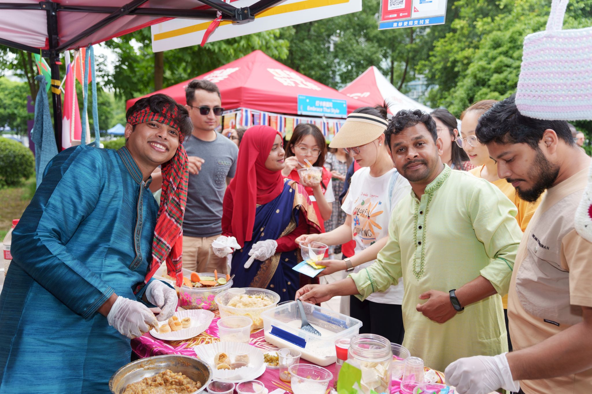 Cosplay秀引爆创意狂欢,留学生们身着各国特色服饰,演绎不同文化角色。各国美食摊位前香气四溢,士库曼斯坦的烤馕、摩洛哥的咖啡、越南的春卷、泰国的芒果糯米饭等应有尽有。留学生们一边分享美食,一边用母语和汉语介绍美食背后的文化故事,不同文化在这里碰撞出绚丽的火花。