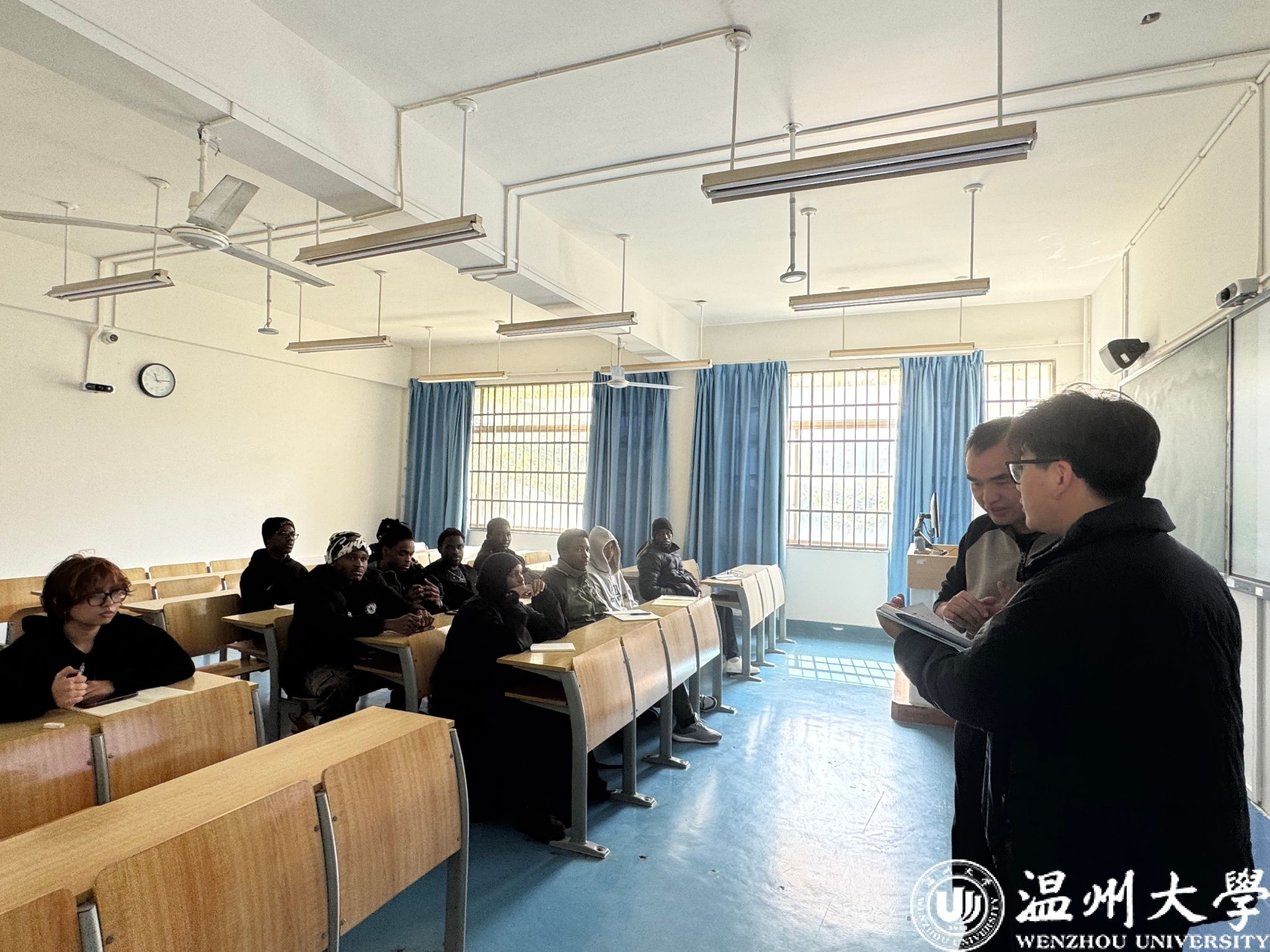 老师们逐一走访留学生上课教室,认真核对出勤情况,并与任课教师进行交流,了解学生假期返校后的课堂表现和学习状态。课间休息时,老师们与留学生亲切交谈,询问新学期课程适应情况,鼓励大家调整状态、认真学习,以饱满的精神面貌迎接新学期。从走访情况看,留学生出勤率良好,课堂秩序井然,师生互动积极,展现出新学期的新气象。