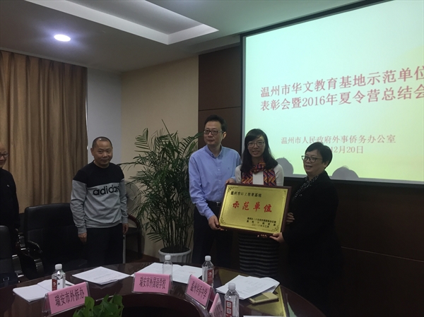 12月20日下午,由温州市人民政府外事侨务办公室和温州市教育局共同主办的“温州市华文教育基地示范单位表彰会暨2016年夏令营总结会”在市外侨办会议室召开。温州市教育局国际交流合作处副处长陈炜、温州市外侨办副主任许捷以及温州各级华文教育基地的负责人出席了此次会议。