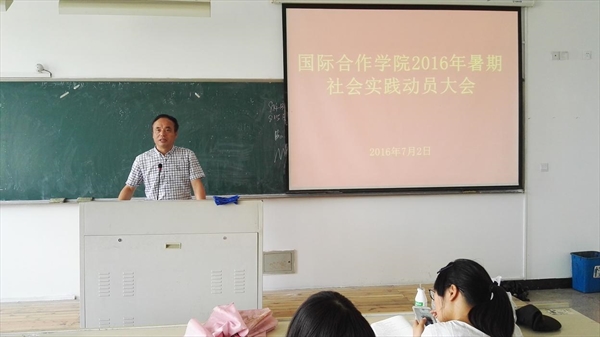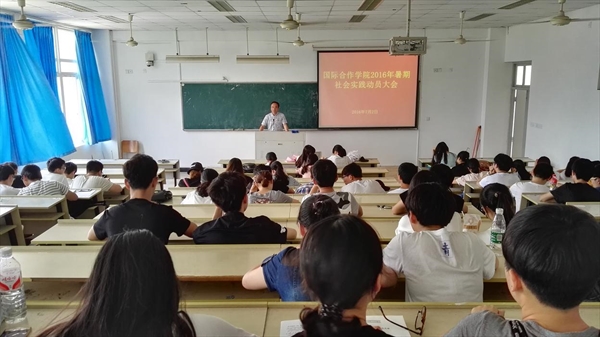 2016年7月2日中午,国际合作学院2016年暑期社会实践动员大会在北校3号楼401教室召开,国际合作学院暑期社会实践队成员62余人参加,学院党总支书记朱建平、学生科长谢坚等参加会议。