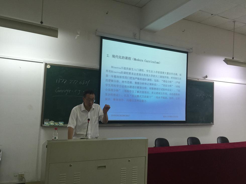 开学第一课,严晓鹏院长为全体新生作 “教育国际化与信息化”的专题讲座。他从沉浸式的全球化体验、现代化的课程、终身的成就支持和真正无地域限制、无歧视的招生这四大变革要素向新生阐述了“Minerva大学的理想”及其办学优势,立足教育国际化与信息化日益成为现今高等教育两大趋势的大背景,他还向新生详细介绍了MOOCs这一全新的国际化课程学习方式,指导新生在语言关、能力关、学业关和自我培训等四个方面合理规划四年的大学生活。最后,严院长展示了学院的发展历程和发展机遇,重点介绍了学院专业学科建设和项目合作情况,希望新生在学院多元国际化的特色氛围中,积极做一名能掌控自己时间的管理者,全面提升各方面的能力锻炼。