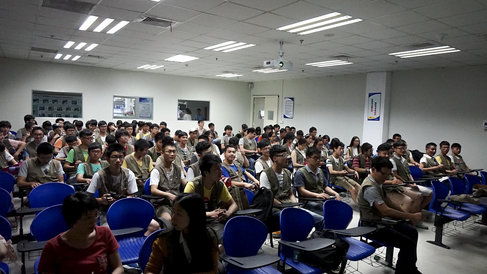 图为两岸项目学生在进入冠捷公司生产线之前听取讲解