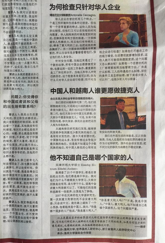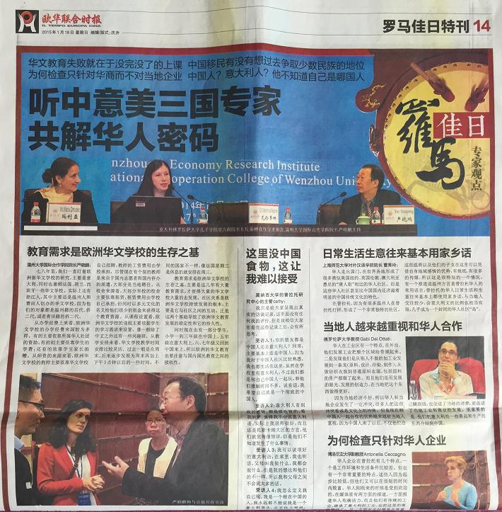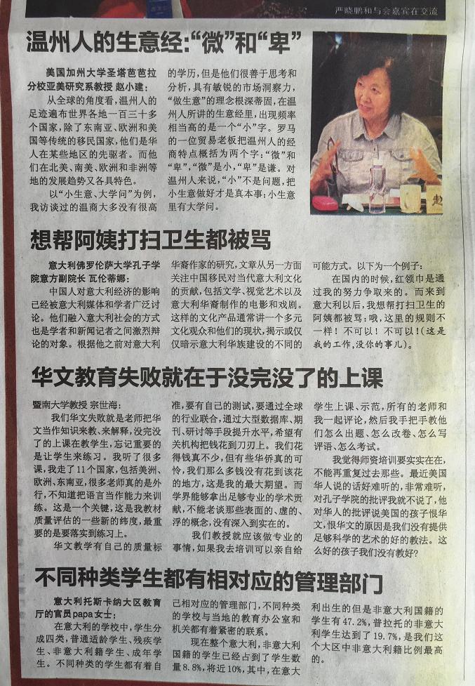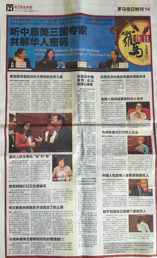 在2015年1月18日出版的意大利第一华文平面媒体《欧华联合时报》上,该报用整版报道了于2014年11月6-7日由温州市世界温州人研究中心、浙江省温州人经济研究中心、beat365中文官方网站主办,beat365中文官方网站国际合作学院承办的“第五届世界温州人研究国际学术研讨会,尤其关注了本次会议中以“普拉托华侨华人社会变迁研究、华文教育与移民语言传承”为主题的的分论坛。论坛上,来自美国加州大学圣塔芭芭拉分校、意大利博洛尼亚大学、意大利佛罗伦萨大学、日本大阪大学、捷克查理大学、台北东吴大学、锡耶纳外国人大学、暨南大学、浙江大学、上海外国语大学、上海师范大学、天津师范大学、中国华侨华人历史研究所、宁波大学等海(境)内外高校和科研机构,以及海外中文学校和报社的专家学者、我校华文教育研究所的多位老师济济一堂,海内外学者畅所欲言,从多学科出发,全方位、多层次地挖掘和提炼海外温州人社会变迁、华文教育和语言文化传承的发展规律。《欧华联合时报》摘录了其中多位专家的观点: