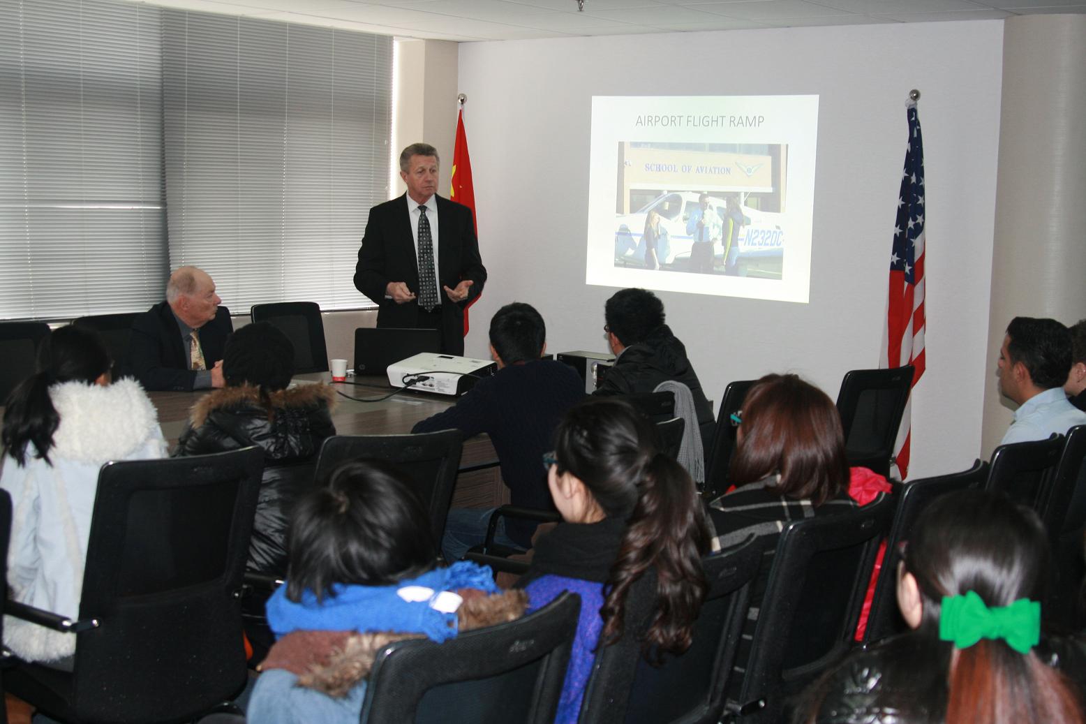 为促进低空飞行领域开发、满足市民对私人航天飞行的需求,通过航空港建设带动相关产业及其创新,进而刺激温州经济发展,此次beat365中文官方网站特邀美国著名的航空学校道林大学前来访问。副院长 Thomas Daly与航空飞行教授James Record向我校师生们展示了其数十年从事飞行和飞行教学的经历,美国道林大学优越的教学环境(包括学校机场),并告诉学生们如何达成梦想。两位教授的介绍让在座的师生不禁流露出惊奇与羡艳,并在其后争相恳请签名、合影留念。