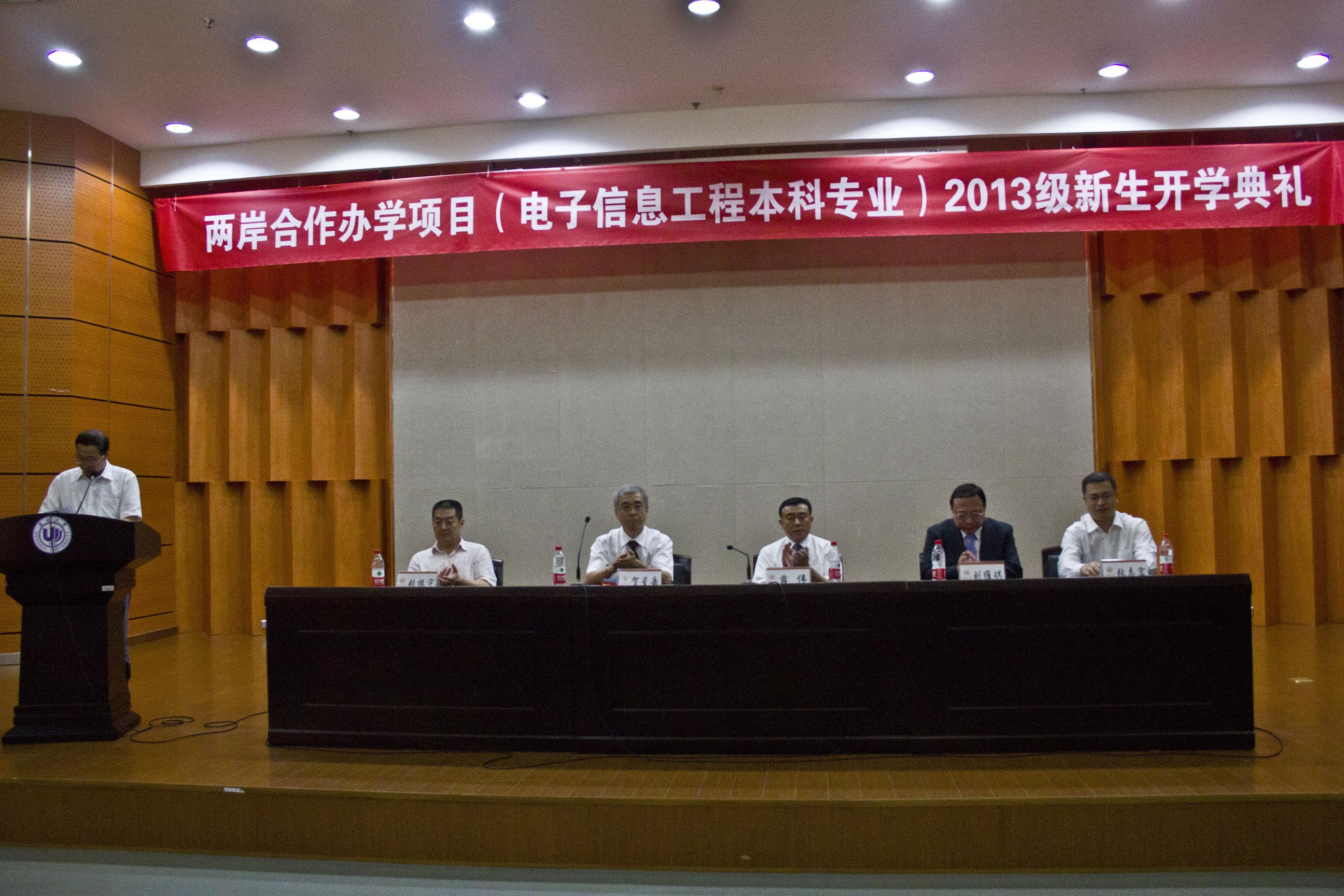 9月13日上午,我校在南校区岩松堂隆重举行两岸合作办学项目(电子信息工程专业本科教育项目)2013级新生开学典礼,台湾中华大学校长刘维琪,我校副校长薛伟、浙江工贸职业技术学院院长贺星岳,温州市教育局副书记、副局长张志宏,温州市台办副主任张振宇以及三校的有关学院、部门领导和老师出席典礼。开学典礼由beat365中文官方网站国际合作学院院长严晓鹏主持。