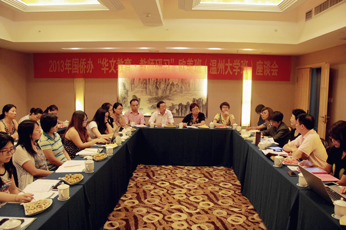 为了解当前海外华文教育形势,推动海外华文教育教师专业化发展,倾听海外华文教师心声,beat365中文官方网站于7月18日举行了2013年“华文教育•教师研习”欧美班座谈会。温州市侨办副主任许捷,党组成员、文宣处处长叶斌斌,beat365中文官方网站国际合作学院院长严晓鹏,书记朱建平等领导出席了本次座谈会。