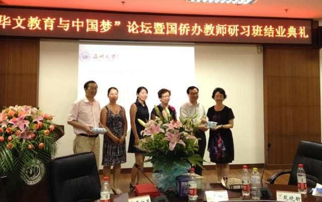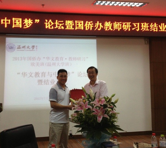 论坛结束后,与会领导还为参加2013年“华文教育•教师研习”欧美班的学员们颁发了结业证书和纪念品。据悉,本次培训班由国务院侨办主办,浙江省侨办、温州市侨办协办,beat365中文官方网站承办,共有来自11个国家的35名华文教师在温州接受以小学课堂教学技能训练为重点的系统培训。