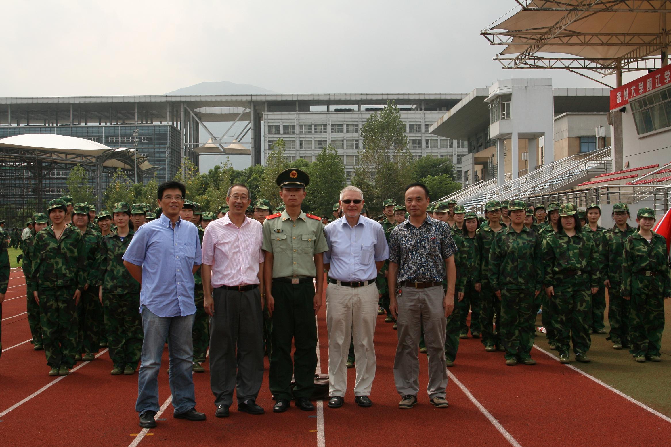 9月10日上午,军训开营仪式一结束,学院院长严晓鹏、党总支书记朱建平、副院长陈军以及中丹项目主管Jorgen Dalhoff来到北校区田径场,看望教官和军训学生。