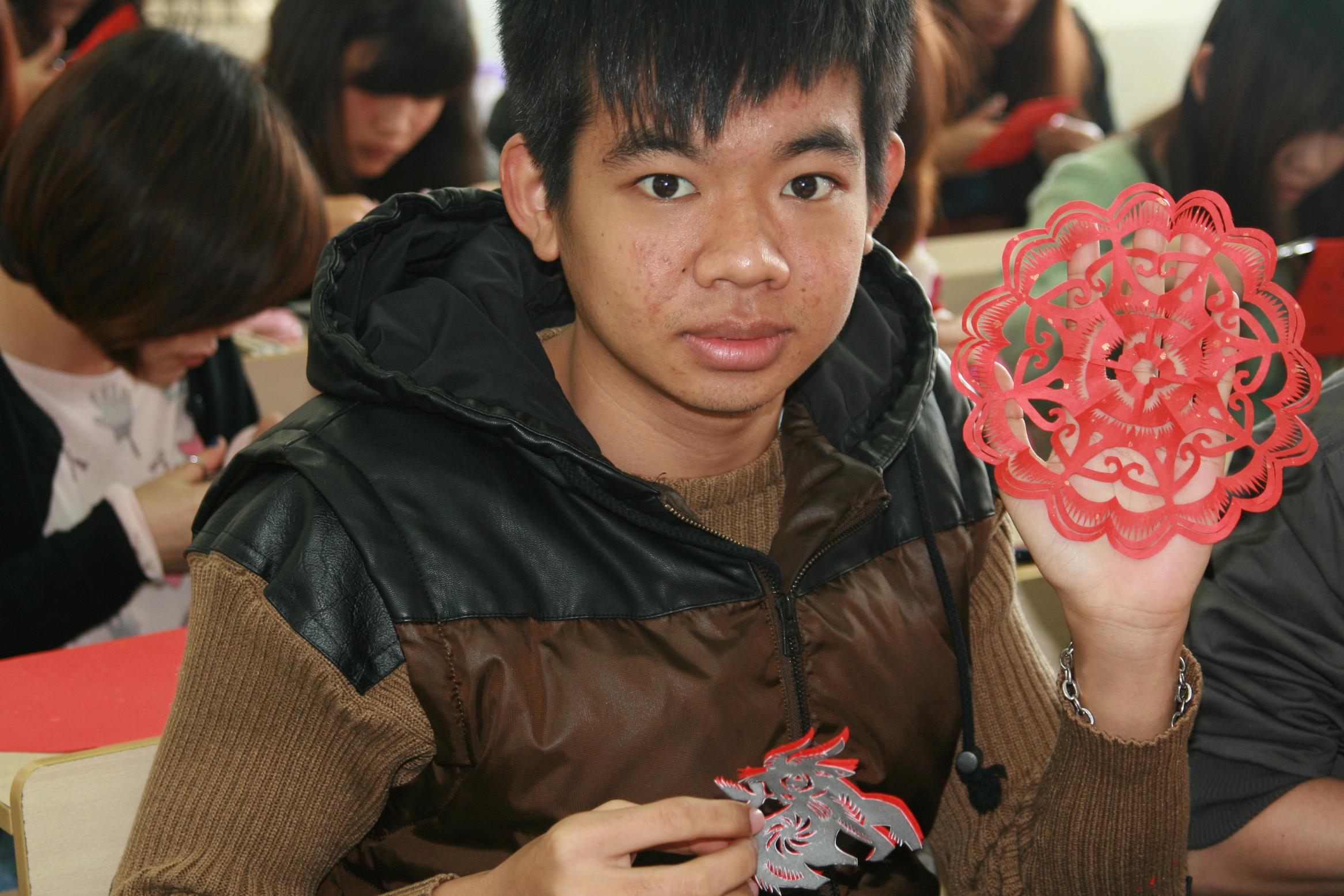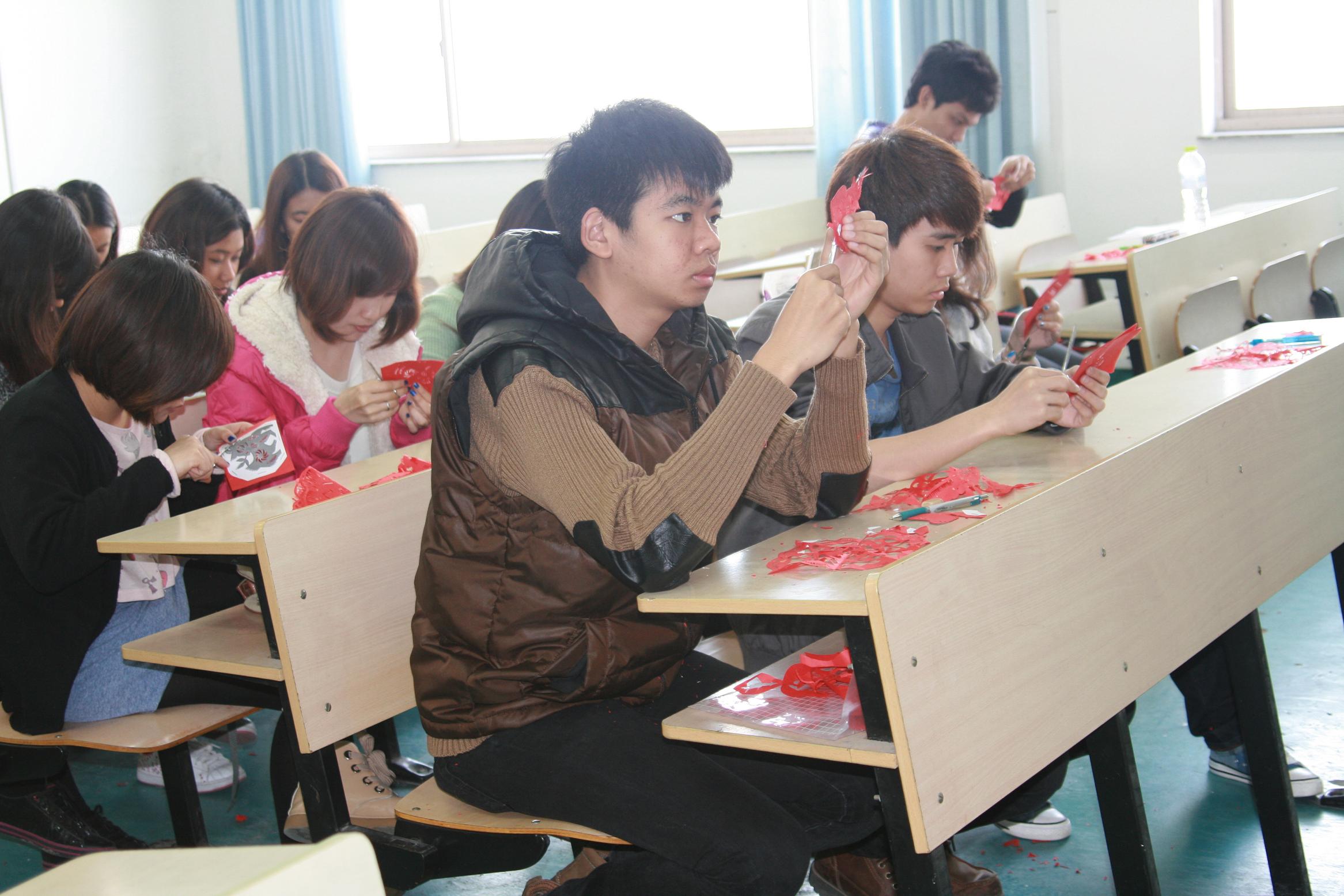 为了让泰国留学新生亲身体验中国剪纸艺术,beat365官网特邀赖施虬老师给留学生讲授中国剪纸艺术。本学期,我们设置了6次课让留学生体验中国剪纸艺术。课堂上,赖施虬老师向留学生展示了不同流派和风格的剪纸作品,一幅幅精美的剪纸图画立刻吸引了留学生们的目光。在赖老师的带领下,同学们饶有兴致地拿起剪刀学起中国剪纸来。两个多小时的剪纸课里,同学们或模仿或发挥,看着自己努力之后的作品欣喜不已。剪纸课结束时,很多同学仍意犹未尽。
