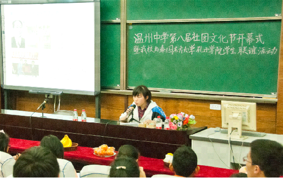 活动伊始,温州中学团委孙斯扬老师详细地向留学生介绍了温州中学社团悠久的文化历史和深厚的文化底蕴,阐述了社团文化节的重要性和积极意义。随后,在温州中学社联副主席图文并茂的详细介绍下,留学生们了解到了温州中学本届社团文化节各项活动的具体安排。