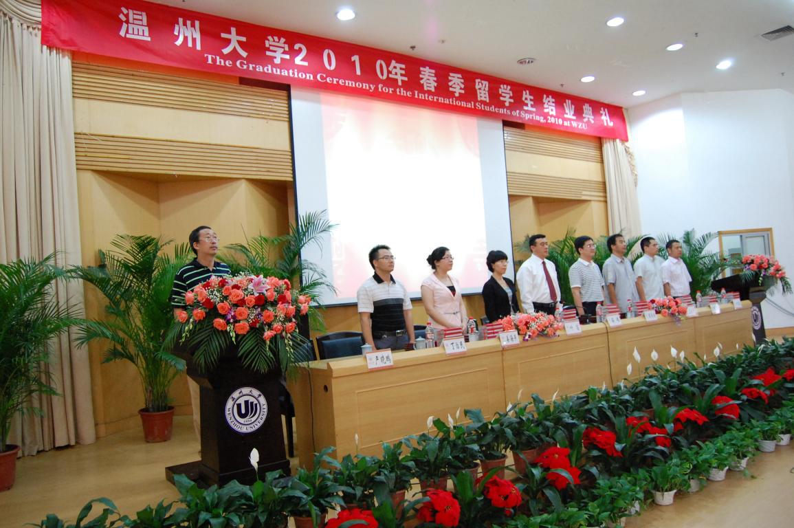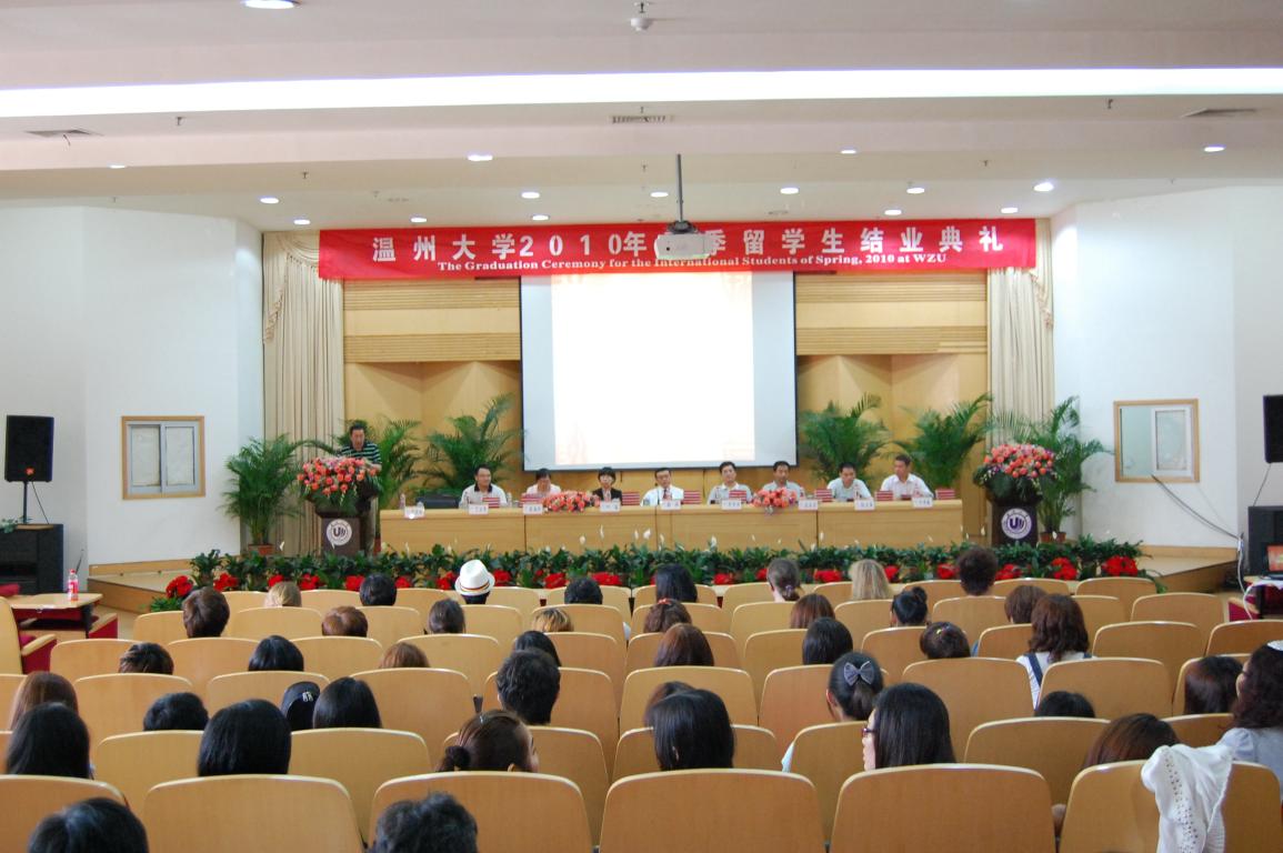 7月1日下午,beat365中文官方网站2010年春季留学生结业典礼于南校区雁山厅隆重举行。副校长薛伟教授出席。外事处、教务处、学生处、校友办公室、团委、人文学院、国际合作学院等部门学院的领导、留学生授课教师代表以及来自泰国、日本、伊朗、西班牙、意大利、荷兰、肯尼亚、南非、加拿大、俄罗斯等10个国家的50余名留学生参加了结业典礼。结业典礼由国际合作学院院长严晓鹏主持。