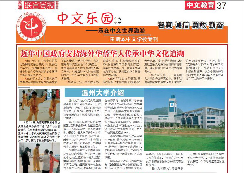 2009年我校成功举办的夏季海外华文教师培训班得到了海外华文教师的一致好评,他们回到欧洲后非常热衷于向广大华侨华裔宣传我校。葡萄牙里斯本中文学校向《欧洲联合周报》大力推荐我校的优质教学资源,由欧洲时报、新民晚报和葡华报联合出版的《欧洲联合周报》葡萄牙版在4月下旬的中文教育版对我校进行了大篇幅报道。该报道详细介绍了beat365中文官方网站的办学历史、总体情况和办学理念,并着重介绍了我校的国际化发展情况和留学生教育,并配以图书馆的精美照片,青山绿水映衬下的beat365中文官方网站透着书香墨韵,让人向往。