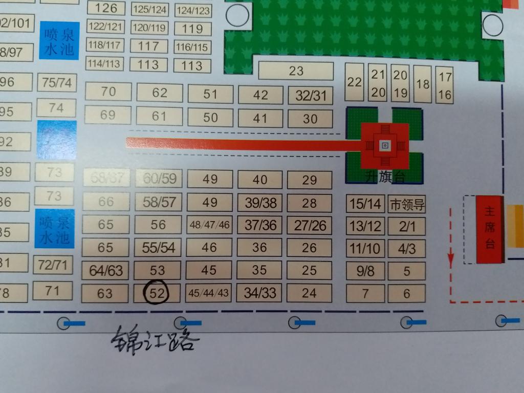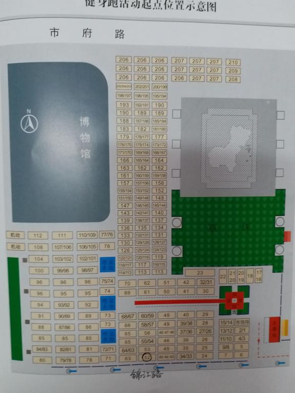 二、本次健身跑我校本部方阵位置处于52号(见附图),各位教工必须穿着校工会统一发放的服装,到场后及时到工会工作人员处签到。跑完全程后集中终点拍集体照。自行到世纪广场的教工必须于上午7:00前到达指定地点。