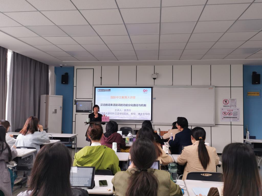 曹教授从自身的汉语国际教学实践经验出发,与在座师生分享了汉语数词来源副词的独特语法表现。她采用共时和历时相结合的研究思路,在共时用法描写基础上,勾勒“X数分”和“X数成”两个系列词语的功能格局,深入探讨了该格局的实现机制,同时结合其他语言相关现象,提出汉语从数量到情态表达不仅具有人类语言的共性,也具有汉语的独有特征,为汉语国际教学提供了新的教学理论与方法。