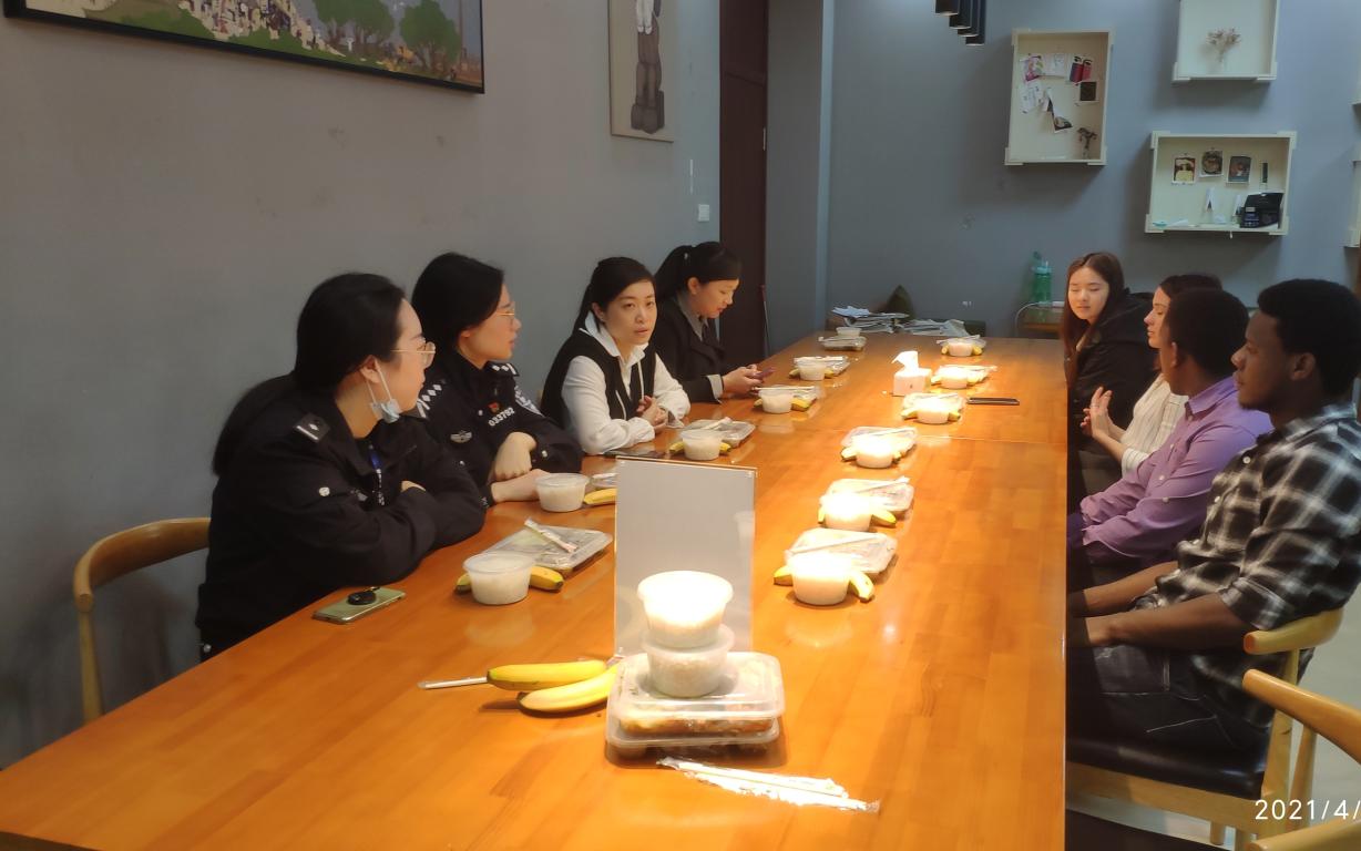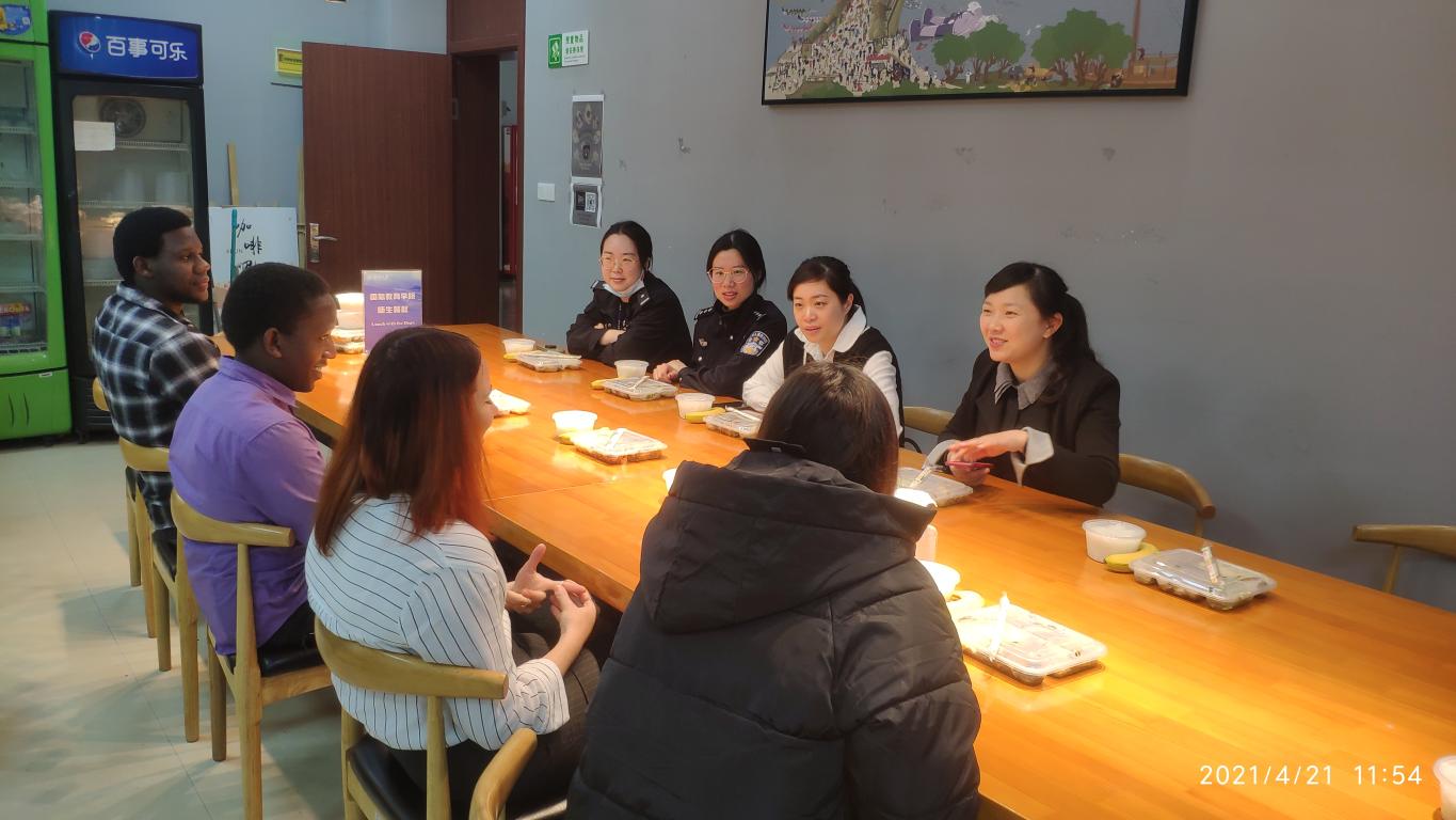 为深入开展党史学习教育,立足为师生办实事开新局。4月21日中午,学院邀请到瓯海区出入境管理大队陈小菲、钟宛芮、郑剔警官与来自意大利、葡萄牙、坦桑尼亚、津巴布韦等国家的6位留学生共进午餐。