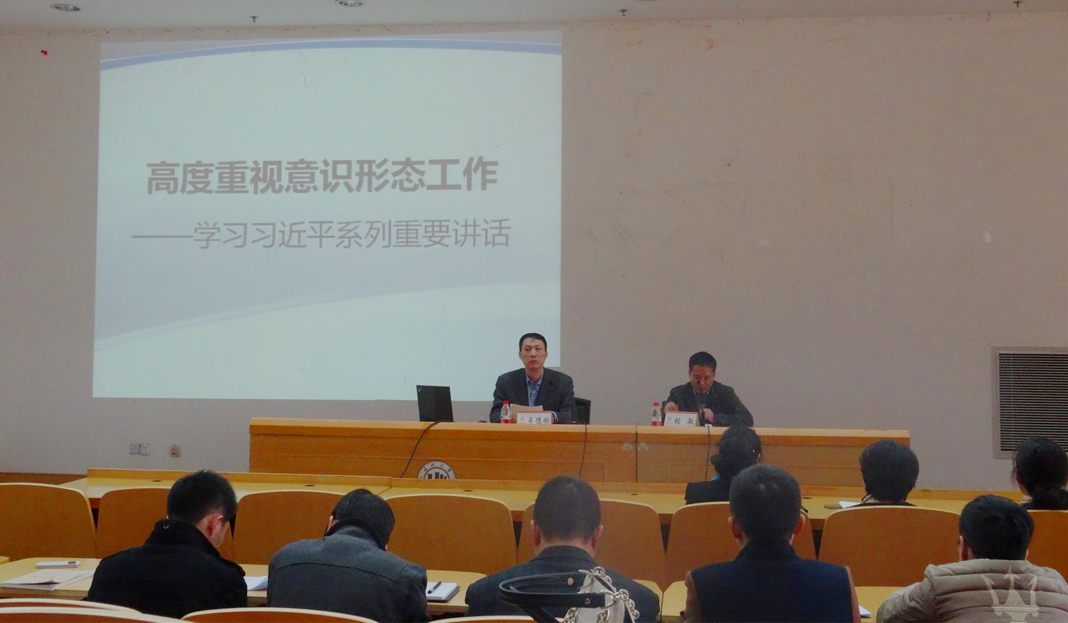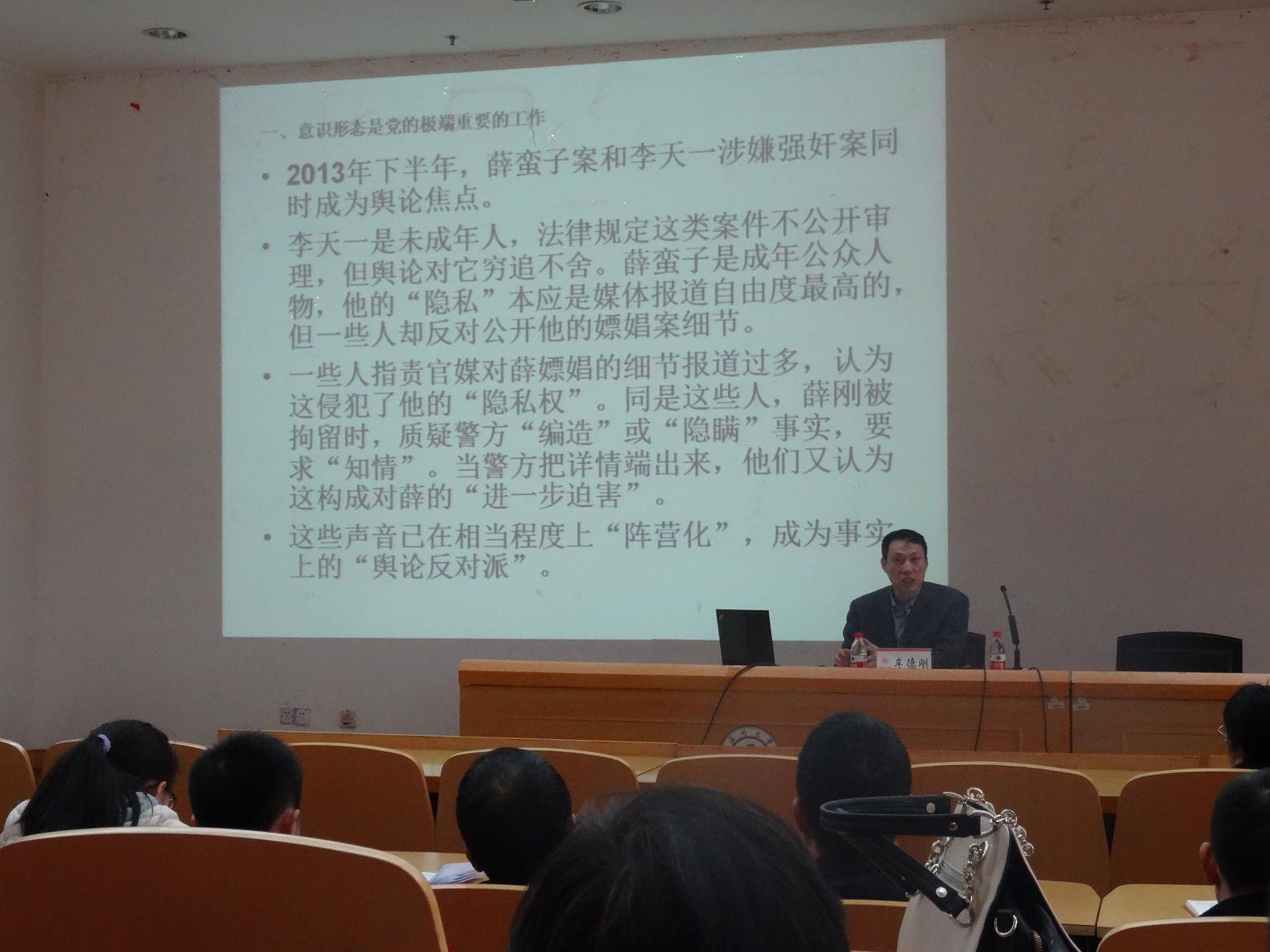 牟德刚结合习总书记的系列讲话,围绕 “意识形态工作是党的极端重要工作”、“意识形态领域斗争的长期性和复杂性”和“增强三个意识,把握工作三权”三个方面展开报告。他立足我校的发展目标任务和当前实际,指出全体老师要高度重视意识形态工作,要围绕根本任务,增强政治意识、阵地意识和责任意识,找准立足点;要根据基本要求,牢牢把握领导权、管理权和话语权,找到着力点。要把握新常态,利用新媒体,增强师德师风的建设。要充分发挥基层党组织和工会、共青团等群团组织在宣传教育工作中的骨干作用,通过党员先进典型的带动作用、广大师生员工的主体作用,形成师生的自觉行动和追求,推动学校和谐发展。