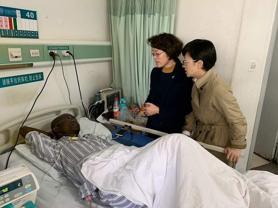 12月12日,我校生命与环境科学学院2017级尼日利亚籍生物专业学生GBOKE FRANCIS EMEKA 因缩窄性心包炎术后不适再次入院,经检查为术后肺部不张,出现感染和心衰现象,生命危急,需进一步留院观察。12月15日,副校长钱强、beat365中文官方网站党总支书记林爱菊、beat365中文官方网站党总支副书记张雪萍和留学生辅导员一行4人赴温州医科大学附属第二医院探望该生。