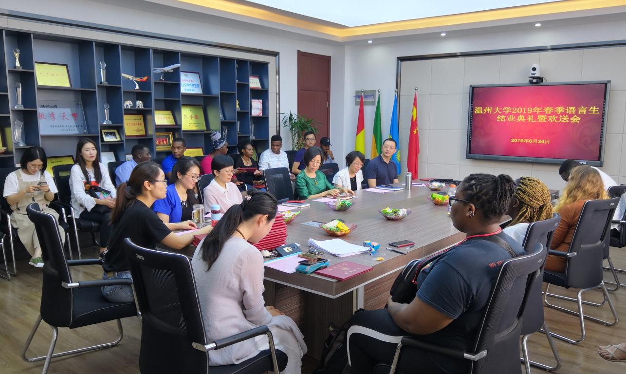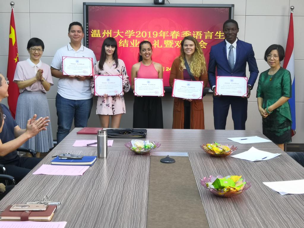 会上,王禄老师作为教师代表发言,她说一学期来已经和同学们从陌生人变成师生和朋友,感受到了他们的成长和汉语水平的提高,“学生们积极的学习状态一直感染着我,督促我更加深入地准备教学内容,我最快乐的事情,就是和学生们一起成长。”她希望结业语言生们常和老师保持联系,及时分享好消息。罗马尼亚籍学生曼德琳和喀麦隆籍学生董琪琛作为结业学生代表发言,他们用中文讲述了在温大学习生活的切身感受。“我们将会把‘求学问是,敢为人先’的校训精神铭记在心”,曼德琳说道。董琪琛对温大老师的责任心、爱心颇有感触,他说:“每当感到很累的时候,一想到负责的老师们,我就努力完成作业,而且要完成得比老师们希望的更多更好,因为我不想让他们失望,希望大家也尊重老师的点滴付出。”他说将来自己还会去更多的国家,遇到更多的人,但是永远也不会忘记在这里学过的知识,不会忘记温大的老师们。