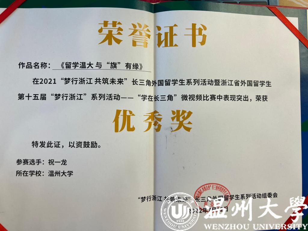 近日,我校两名留学生的视频《瓯城腔调》和《留学温大 与“旗”有缘》荣获2021“学在长三角”微视频比赛优秀奖。