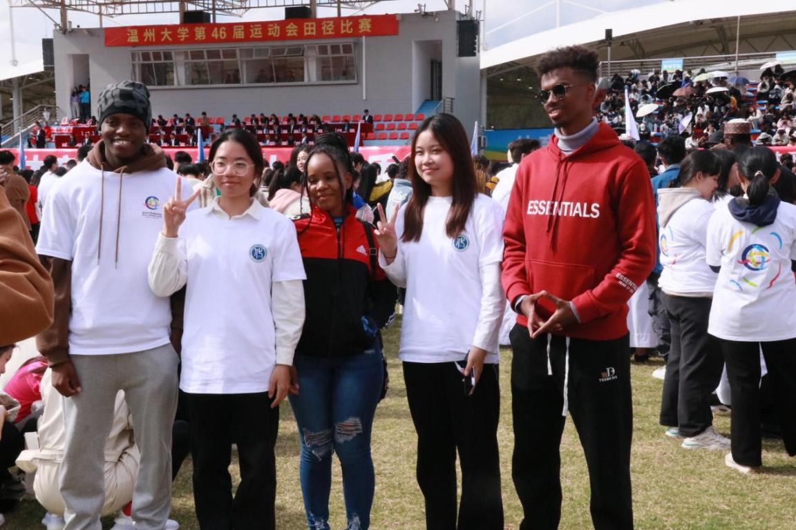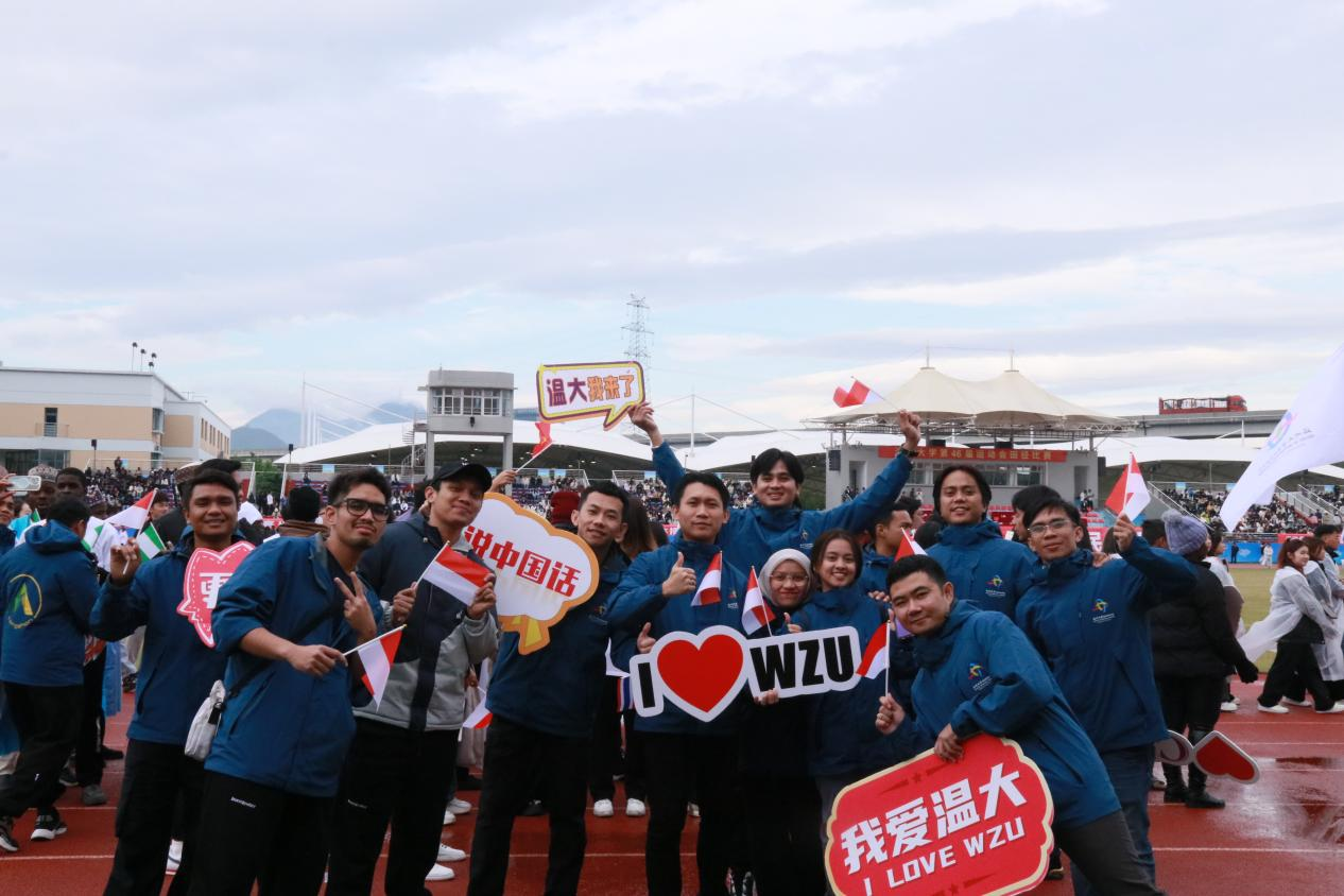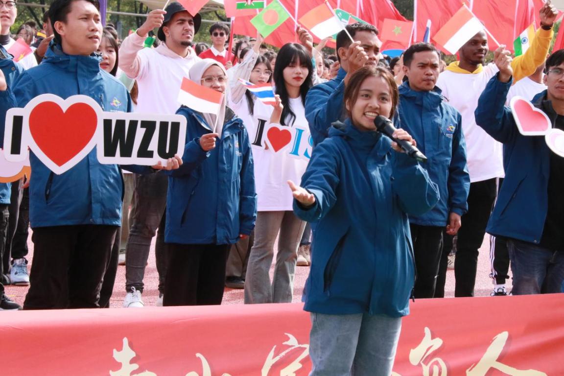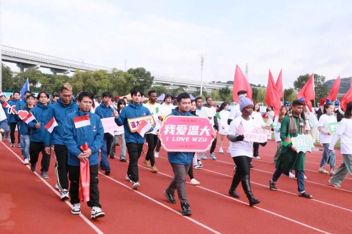 看,迎面向我们走来的是beat365中文官方网站代表队。来自五洲四海的国际学生们怀揣梦想汇聚温大,他们身着民族特色服饰,手举世界各国国旗,自信的步伐,热情的笑容,洋溢着体育和文化的美妙融合!“我和你,心连心,共住地球村;为梦想,千里行,相会在温大......”来自印度尼西亚的杨圣芮带领大家齐唱《我和你》,文化交流碰撞,奏响青春乐章,现场掌声不断。