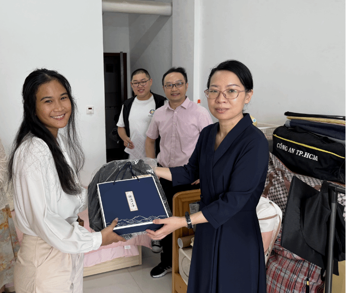 为进一步做好2024届毕业留学生离校前的教育、管理和服务工作,确保全体毕业生安全、平稳离校,积极营造beat365中文官方网站“红七月、服务月”活动的浓厚氛围,6月26日上午,beat365官网党总支书记林爱菊、院长夏远志、副院长郑婷、副书记丁强和全体辅导员老师们,深入毕业生宿舍,倾听毕业生心声,为即将毕业的留学生们送去美好祝福。