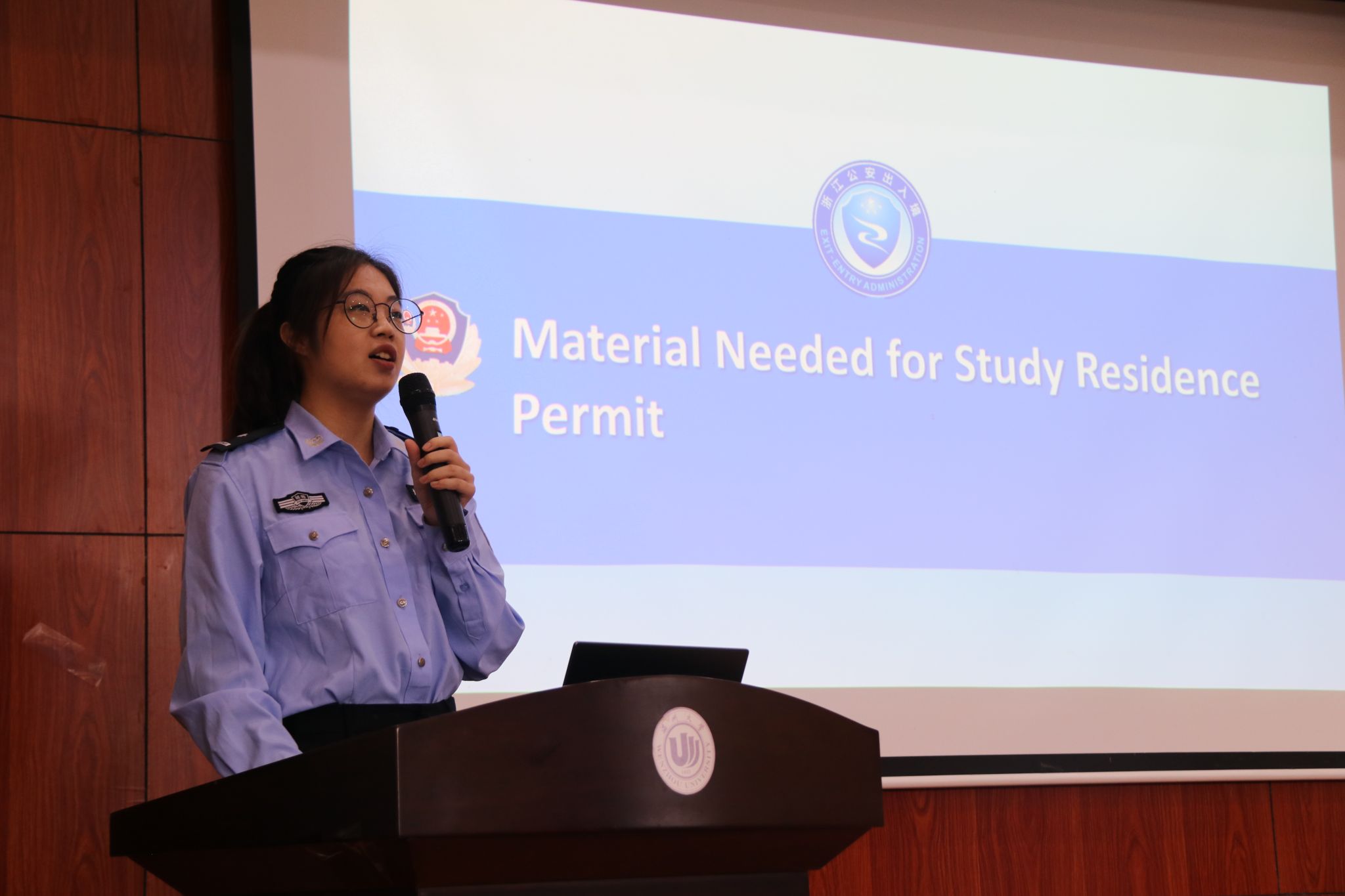 瓯海区公安分局出入境管理大队麻晓军大队长、林叶彤警官为国际学生们详细讲解了签证管理规定和外国人出境入境相关法规,使新生们对签证办理流程和相关要求有了更清晰的认识,最后林警官还与新生们以趣味问答的方式互动,加深了学生的记忆。