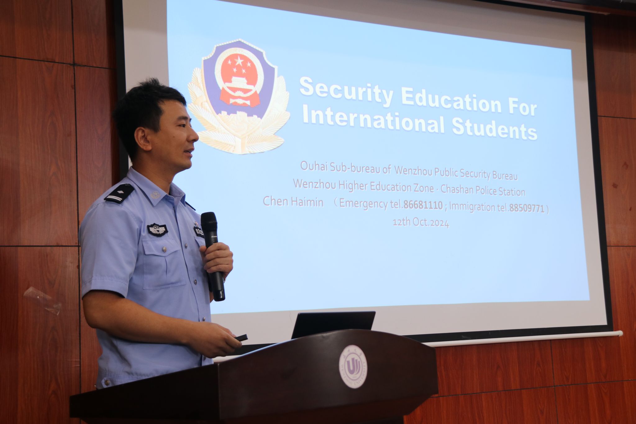 温州市公安局瓯海区分局茶山派出所陈海敏副所长,为国际学生们开展了一场中国法律、安全、禁毒、反诈骗宣传等讲座,帮助他们进一步增强安全观念。