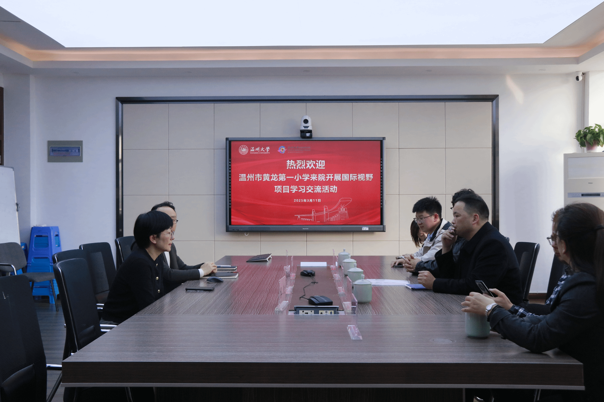 3月11日下午,温州市黄龙第一小学校领导一行来beat365官网交流访问,双方围绕留学生实践活动及小学国际化建设两大主题展开探讨。黄龙第一小学党支部书记、校长陈利汉,专职副书记林湖旭,副校长陈晓敏、林茜茜、叶庆华等参加会议,beat365官网党总支书记林爱菊、副书记丁强热情接待并陪同交流。
